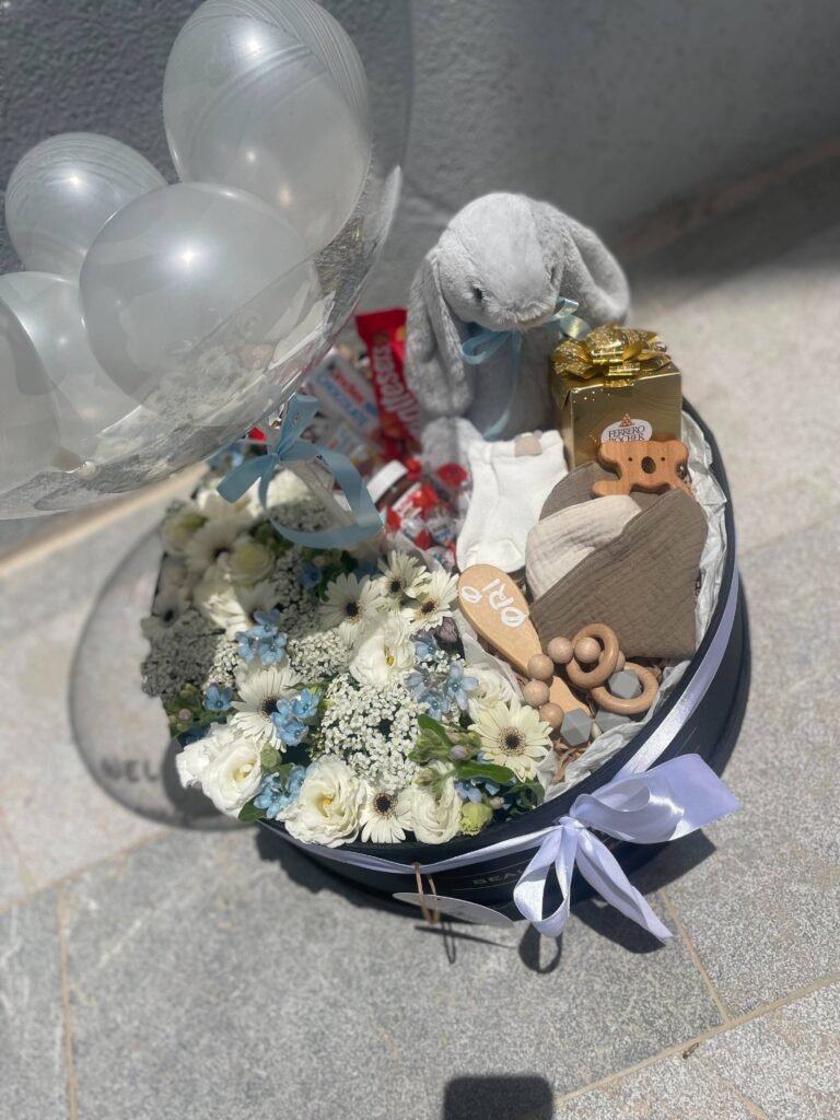 מארז ענק -פרחי העונה+בלון הקדשה אישית +שוקולדים איכותיים+ דובי ומוצרי בייבי בוטיק
