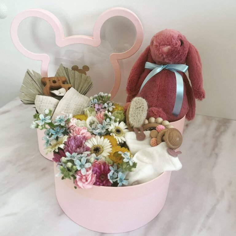 מארז פרחי העונה+דובי+מוצרי בייבי בוטיק