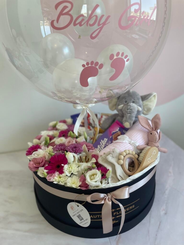 מארז ענק -פרחי העונה+בלון הקדשה אישית +שוקולדים איכותיים+ דובי ומוצרי בייבי בוטיק