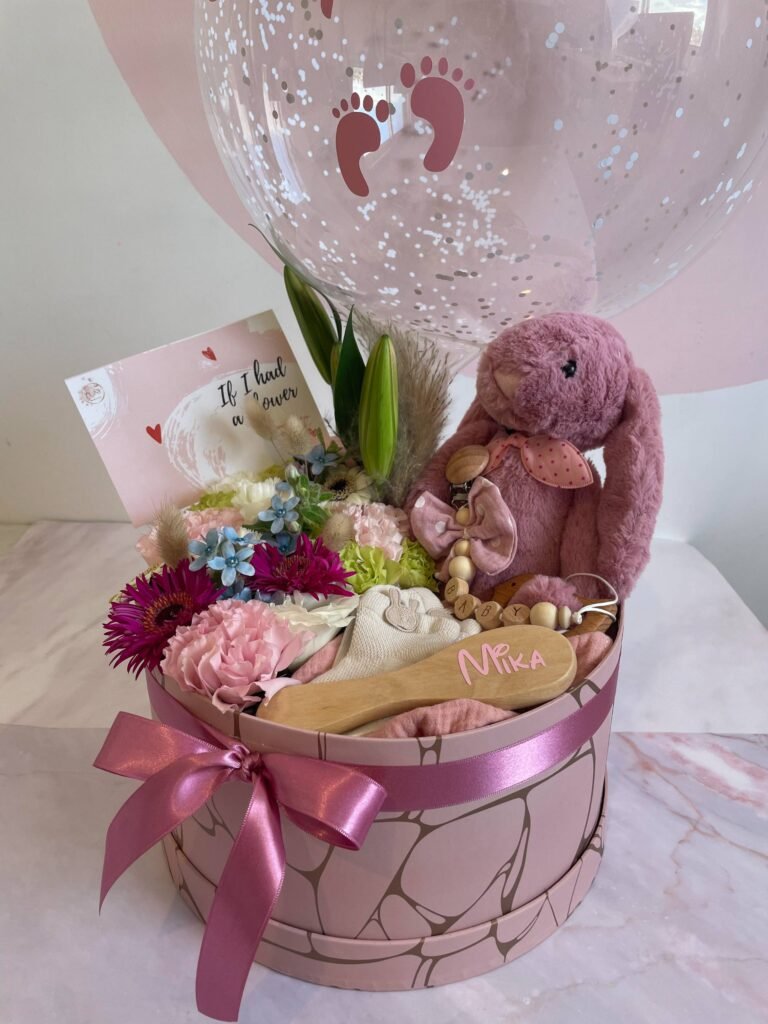 מארז פרחי העונה +בלון עם הקדשה+דובי+מוצרי בייבי בוטיק