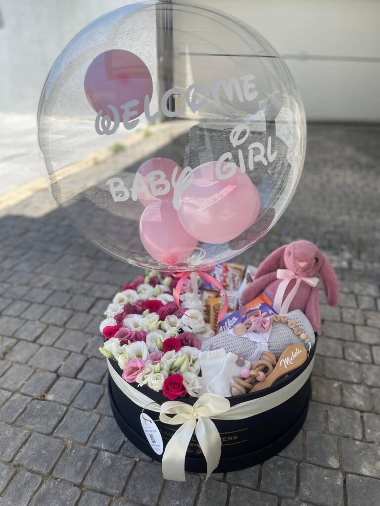 מארז ענק -פרחי העונה+בלון הקדשה אישית +שוקולדים איכותיים+ דובי ומוצרי בייבי בוטיק