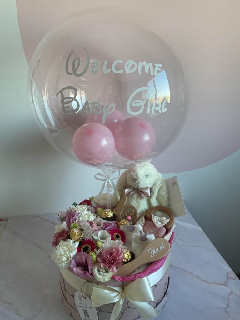 מארז פרחי העונה+בלון עם הקדשה+שוקולד איכותי+מוצרי בייבי בוטיק