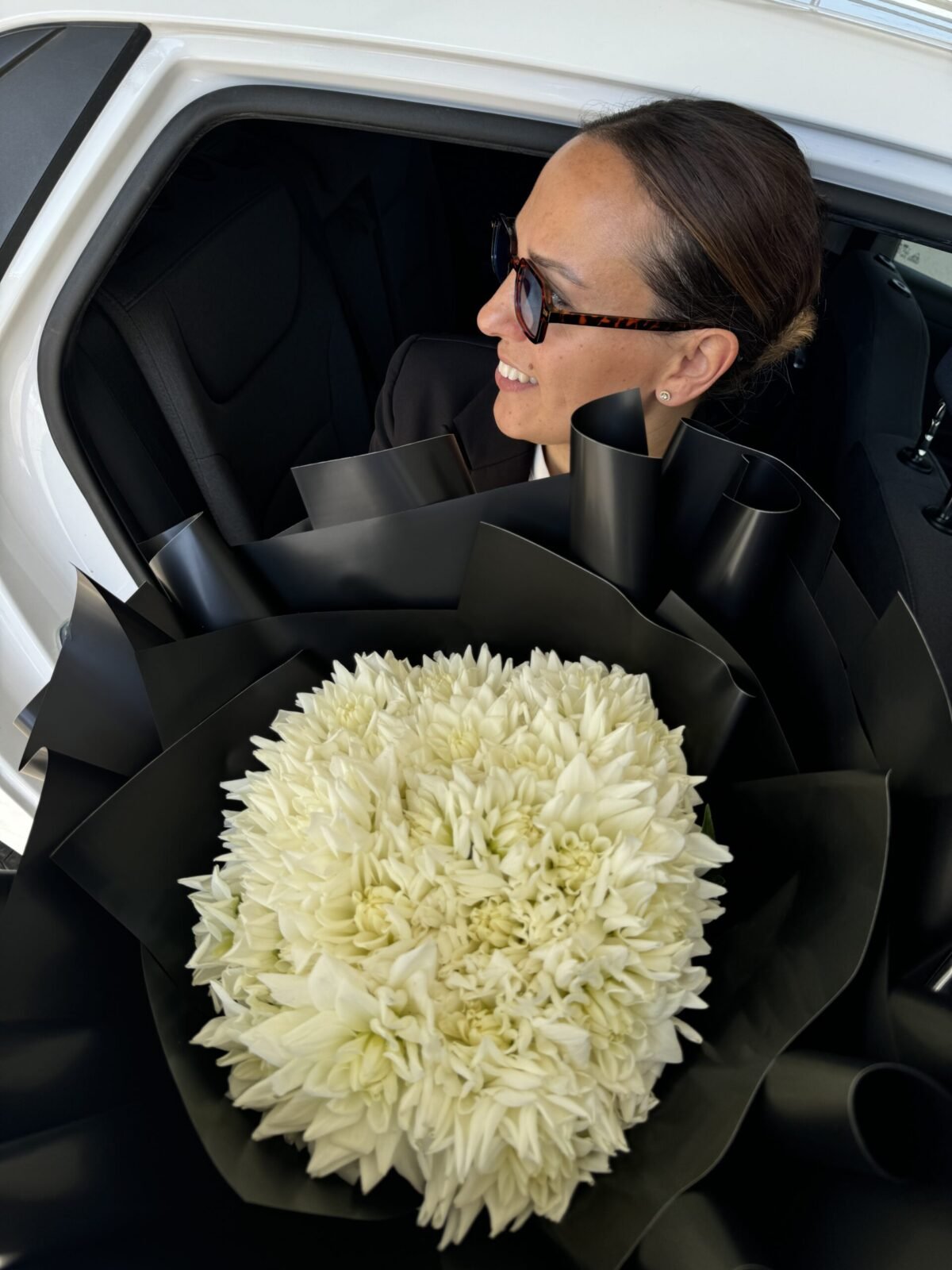 זר פרחים לבן בעטיפה שחורה יוקרתית