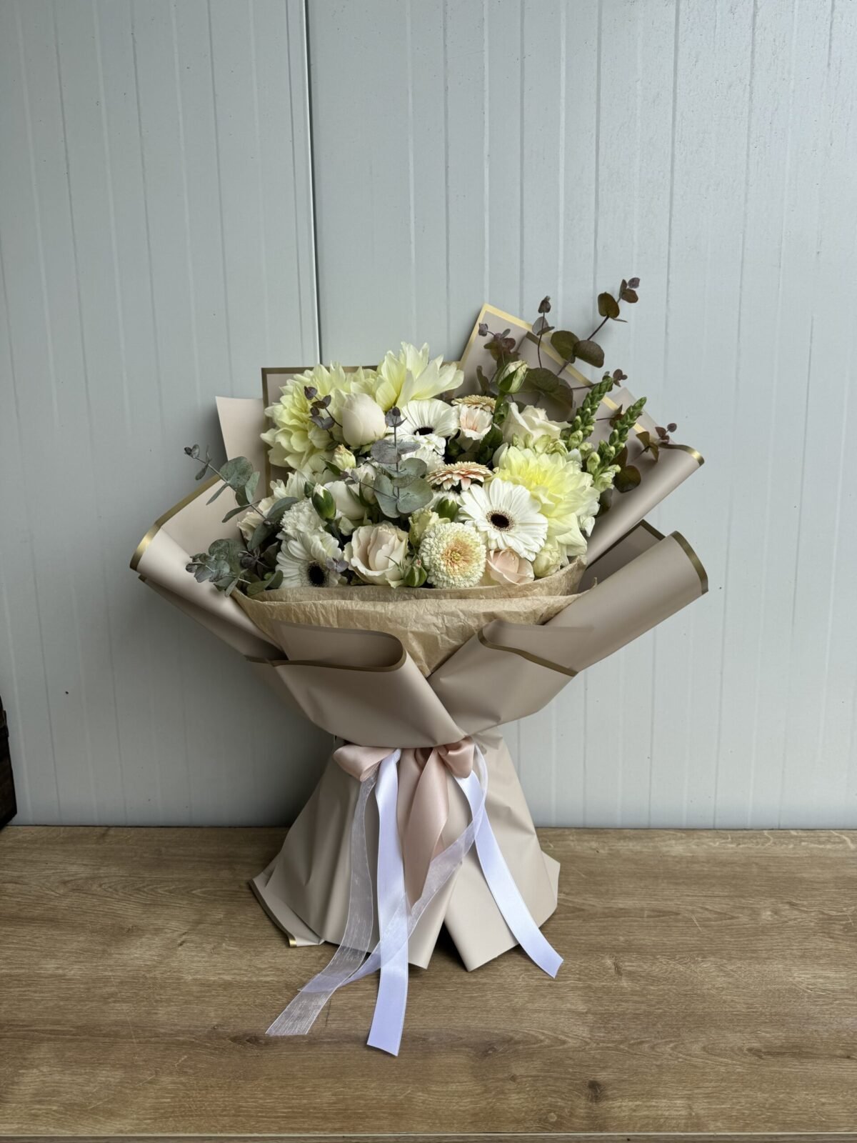 זר פרחי העונה בגווני לבן- עטיפה יוקרתית