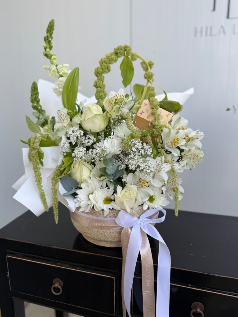 סידור פרחים לבן וחגיגי בכלי חרס יוקרתי+ שוקולד כשר לפסח