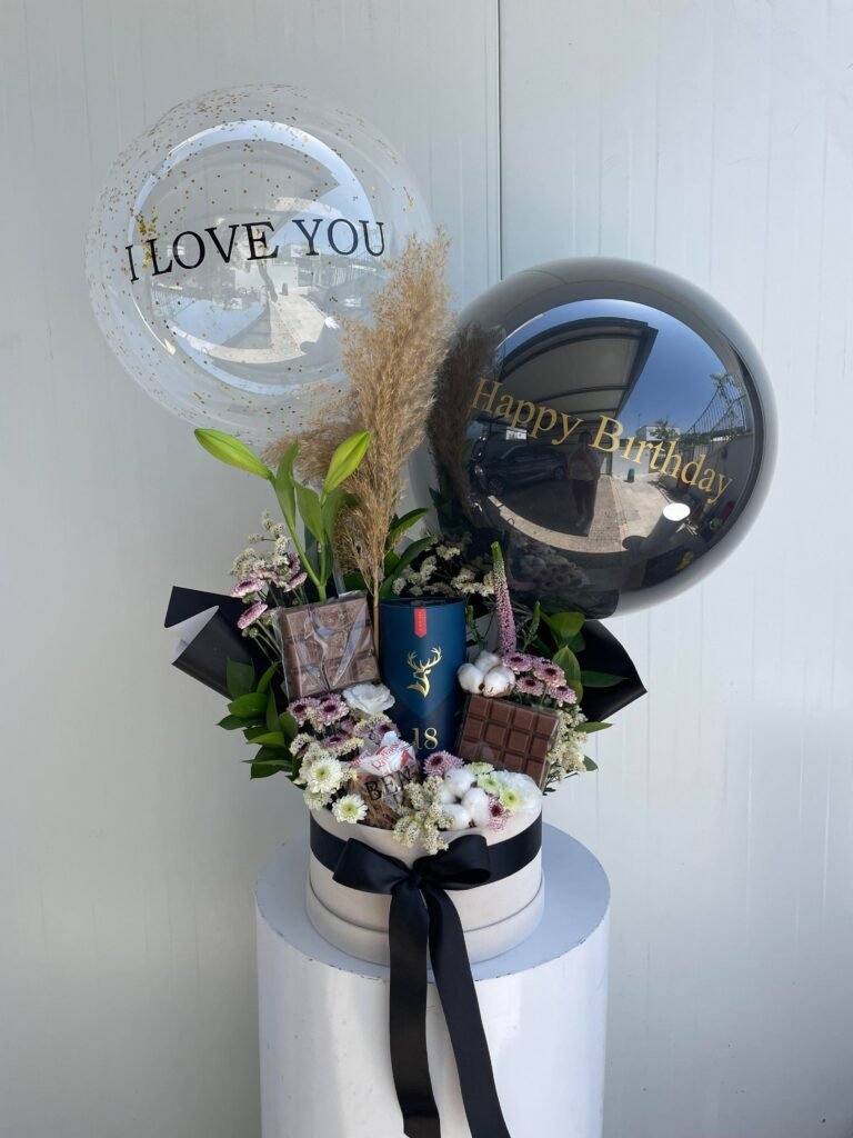 מארז פרחי העונה +בלונים+שוקולדים+וויסקי