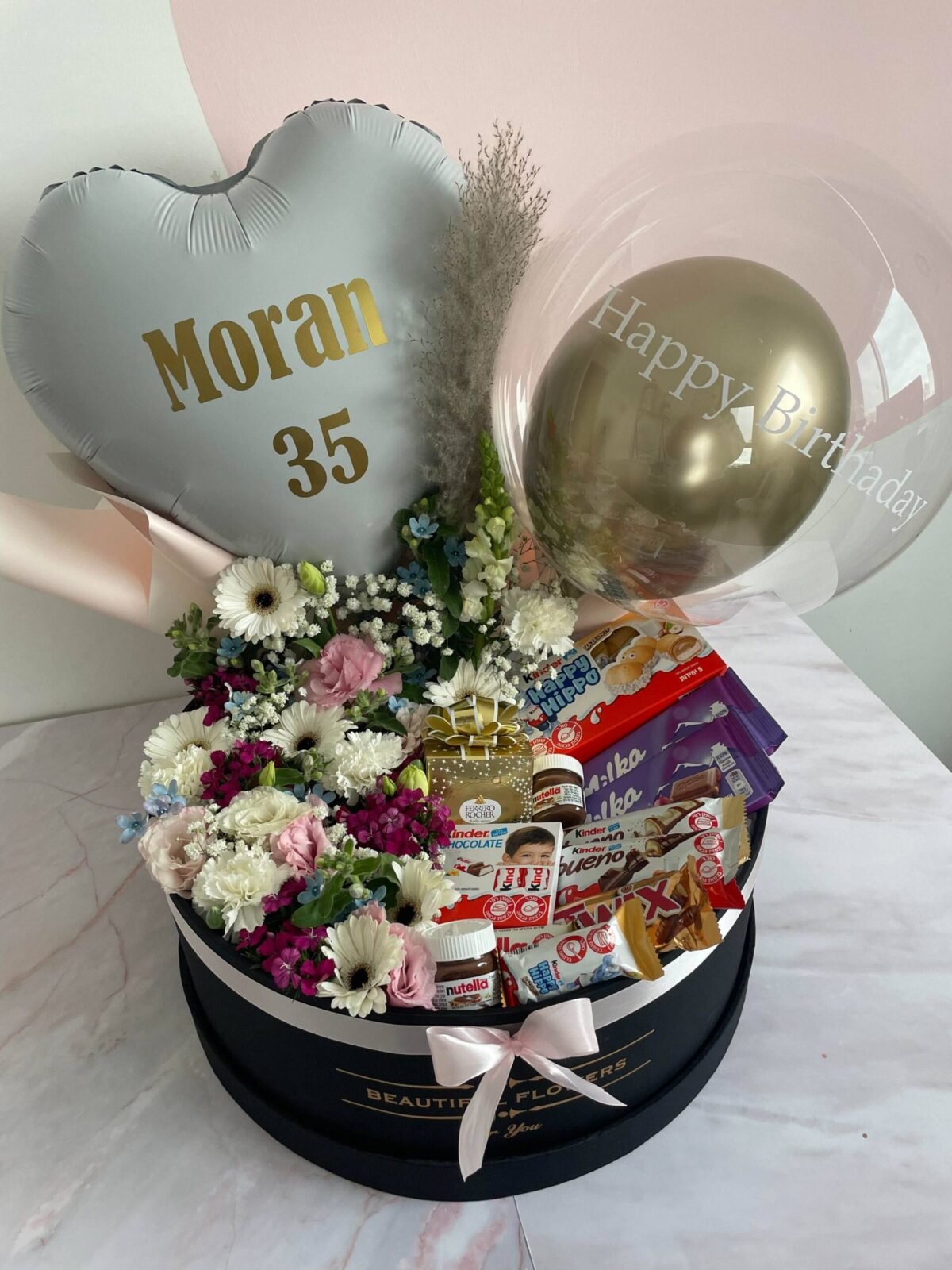 מארז ענק פרחי העונה +שוקולדים איכותיים+בלונים עם הקדשה