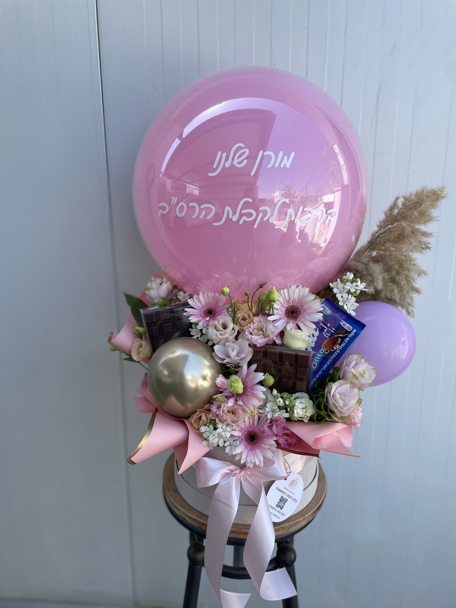מארז פרחי העונה+שוקולדים איכותיים+בלון הקדשה אישית
