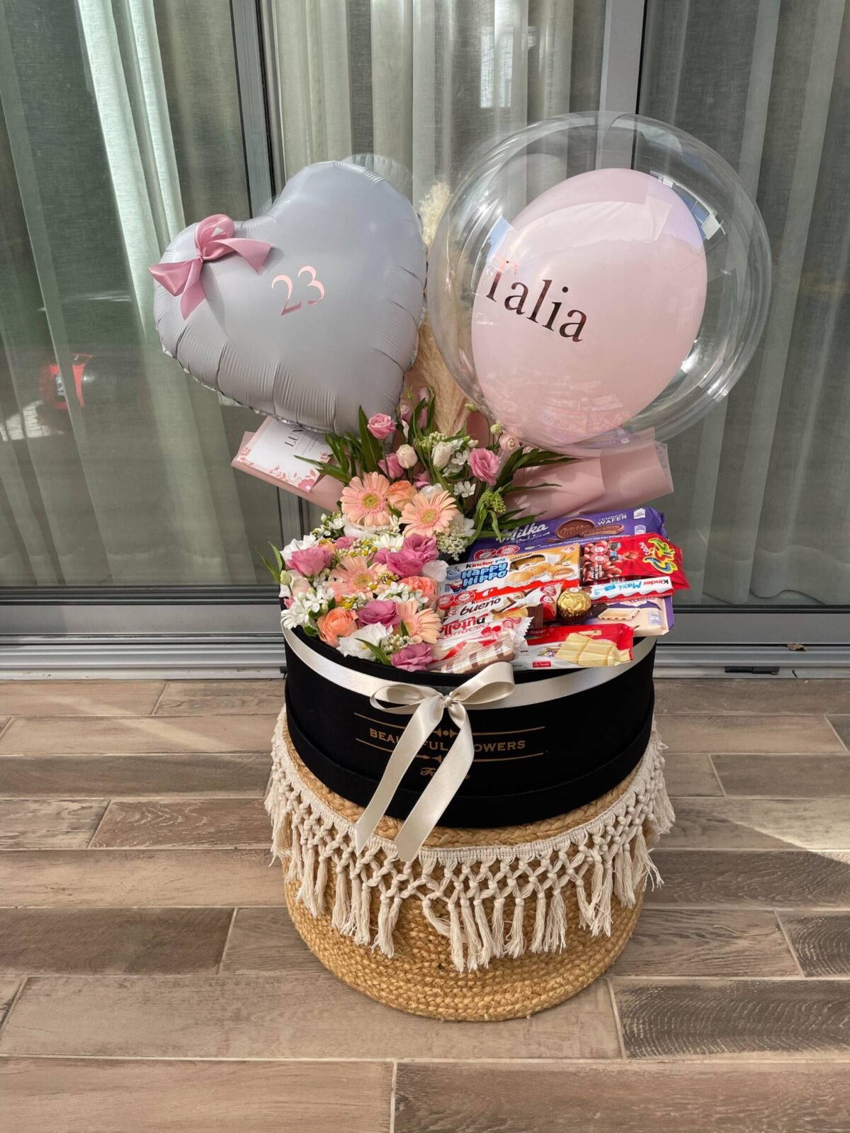 מארז ענק פרחי העונה+בלונים עם הקדשה+ שוקולדים איכותיים