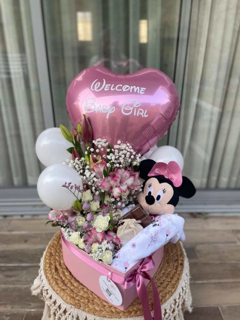 מארז פרחי העונה+בלון עם הקדשה+שוקולד איכותי+דובי+מוצרי בייבי בוטיק