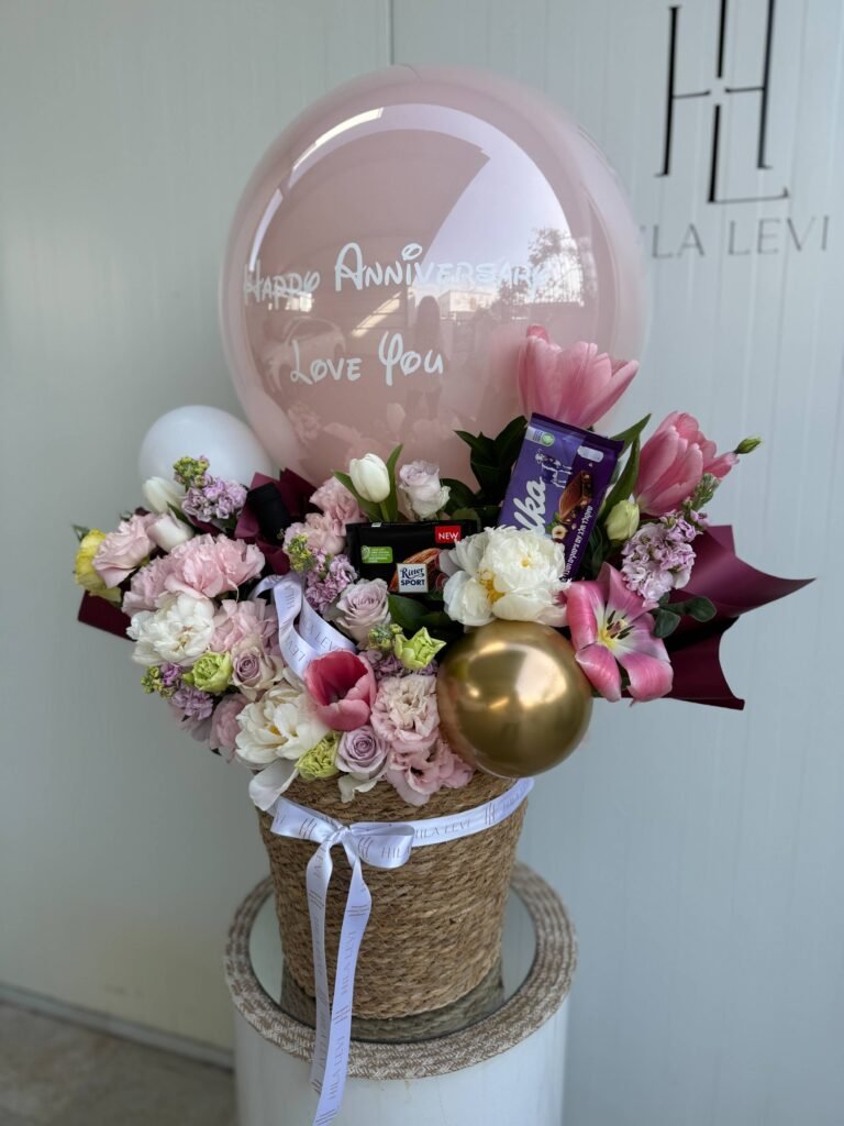 סידור פרחים עשיר בשלסילת קש+בלונים+שוקולד+יין