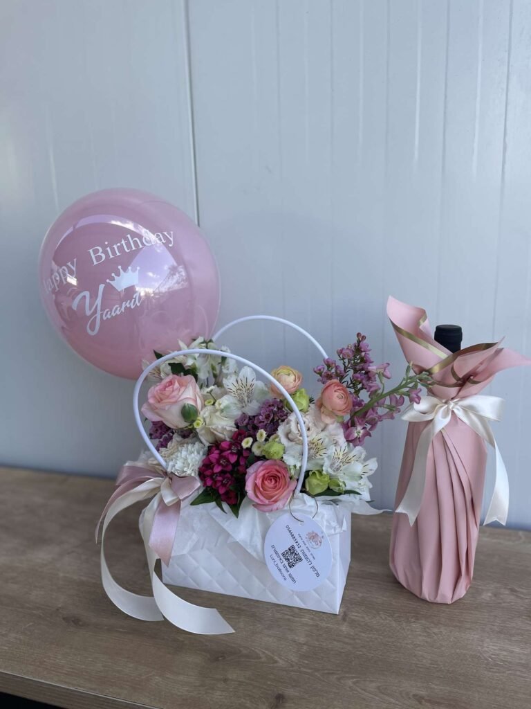 תיק פרחי העונה +בלון עם הקדשה+ יין אדום/לבן עטוף